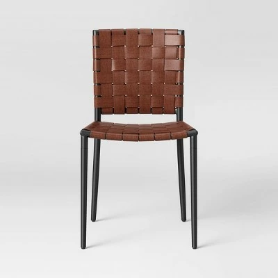 Add stylish seating to your dining space with this 2-Pack Wellfleet Woven Leather Metal Base Dining Chairs from Project 62™. Showcasing a beautifully woven leather design on the seat and back, this twin pack of armless chairs lends an artistic touch to your home. Set on metal frames, these dining chairs boast a sleek look that’s perfect for dining or as extra seating anywhere else around your home. Just place these faux-leather dining chairs around your dining table to create a complete dining setup for family or guests.