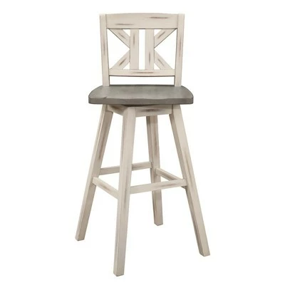 Creating a subtle rustic look for your dining space is the Amsonia Collection. A white sand-through finish graces the solid rubberwood 29-inch divided X-back swivel counter height chair, highlighting the veneer.Features : Made of solid rubberwoodDistressed gray and white finish360-degree swivelDivided X-backBar height designSpecifications : Product Dimensions : 42.5″H x 18″W x 18″DSeat Dimensions : 28.5″H x 18″W x 13.5″DProduct Weight : 48 lbsWeight Capacity : 250 lbsAssembly Required : Yes