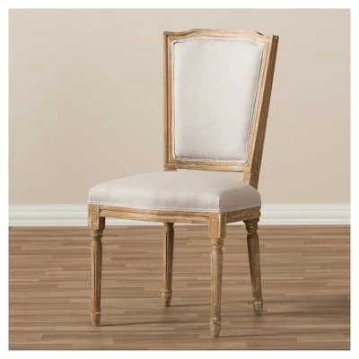 The Cadencia dining side chair evokes French style, lending romantic inspirations to transitional dining rooms and living spaces. The warm carved frame boasts artistically weathered detail for charming antique appeal. Neutral upholstery in beige linen provides a contemporary yet elegantly muted color to this stunning plush seat. Constructed of solid oak frame, the Cadencia will pass the test of time. A gorgeous complement to a traditional table, the Cadencia dining chair delights with a vintage aesthetic. Made in China, the Cadencia will arrive fully assembled.