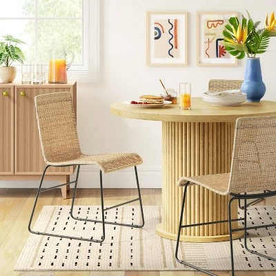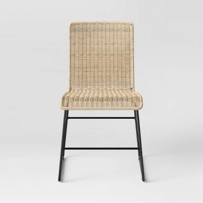 Sleek and stylish, this Chapin Modern Woven Dining Chair with Metal Legs from Threshold™ makes a functional addition to your home. Supported by sleek metal legs, this dining chair features a woven seat and back for a touch of artistic style that helps make your dining decor an elegant affair. Plus, the natural seat and back complement the black metal frame for gorgeous contrast and easy mixing with existing decor. Place this armless dining chair in your dining room or any other area in your home to sit in comfort and style.