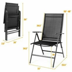Our patio foldable chair set is sure to be perfect patio furniture for your home. Made of high-standard steel frame with powder-coated finish, this chair has high stability and strong durability. The breathable fabric is durable enough to support large weight capacity. Triangle structure ensures e xtra stability that the chair won’t shake easily when you sit on it. What’s more, the backrest can be adjusted according to your different needs. Quick folding design is convenient for storage and transportation, which helps to save a lot of space for your home. Such a lightweight and practical chair can be well matched with deck, porch, poolside, garden yard as well as dining room. Give yourself some leisure time to relax with your favorite book or just drink a cup of coffee with our outdoor folding chairs! . Specification: Color: Black. Material: steel + fabric. Overall Dimension: 23.5” (L) x 22”(W) x 40”(H) . Folding Dimension: 34” (L) x 24”(W) x 2.5”(H) . Net Weight of Each Chair: 12 lbs. Ma x Weight Capacity: 350 lbs. Package includes:. 4 x Folding Chairs.
