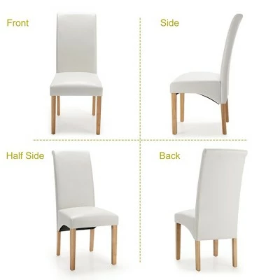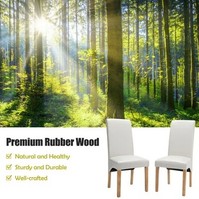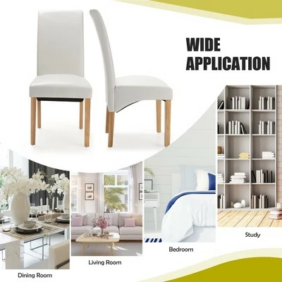 This dining chair set will be a great home decor for your living room, study, dining room, etc.. The chairs are not only sturdy with solid rubber wood legs which ensure strong weight capacity of 330lbs, but also comfortable with soft and elastic cushion. And the premium PVC leather resists well to scratch and split, ensuring the long-lasting service time. Likewise, the PVC surface is also waterproof so the daily maintenance won’t cost too many efforts. The ergonomically designed high backrest will make your back fully relax ed without any stress or fatigue. And you won’t feel pain even after long-time sitting. Also, the chair is a perfect combination of high utility and elegance. . Specification: Color: BlackBeige. Material: PVC Leather + Sponge + Rubber Wood. Overall Dimension: 18” x 24.5” x 40.5” (L x W x H) . Seat Depth: 17” . Seat Height: 19.5” . Net Weight: 30lbs. Weight Capacity: 330lbs. . Package Includes: . 2 x Dining Chairs. 1 x Instruction.