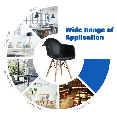 Our mid-century arm chairs will be the indispensable part of your home. This set of 2 dining chairs features curved back and armrest. They well fit the curve of human body, helping relieve your fatigue of a day’s hard work. The rounded seat edge will reduce pressure on your legs. Supported by high-quality beech wood legs with black x-shaped iron wires, these side chairs are sturdy and durable for safety use. The white molded seat shells will fit in well with any classic or modern room layout, bringing a touch of minimalism to your room decor. Refresh your home decor with this set of 2 modern chairs. . Specification: Color: Black. Material: PP + Beech Wood. Net Weight: 18 lbs. Overall Dimension: 24.5”(L) x 24”(W) x 31”(H) . Weight Capacity: 330 LBS. Package includes:. 2 x Dining Chairs.