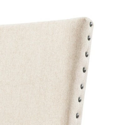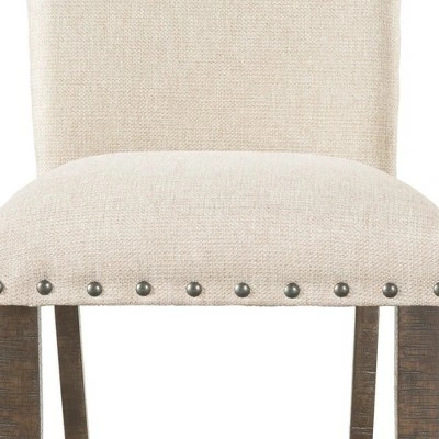 The Picket House Furnishings Dex Upholstered Side Chair Set gives your dining room a hint of rustic charm. Its comfy foam filled seats are upholstered in a charming cream linen and accented by a metal nail head trim. Smokey walnut finished legs featuring distress marks give this chair a slightly weathered look and a cozy feel.