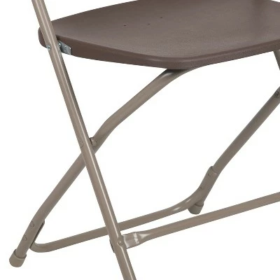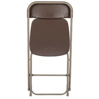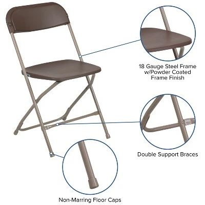 Whether you’re the designated host for holidays and special family events or have your own event planning or catering company this set of 2 brown plastic folding chairs is a perfect solution to your seating dilemma. Extra seating in the home is always a plus or purchase multiple sets of these ultra-strong folding chairs to have your own chair rental business for extra income. Built from premium commercial grade materials and featuring an 18 gauge steel frame with double support braces, these ready to use chairs will accommodate up to 650 lbs weight capacity. The contoured plastic back and textured seat provide the highest level of comfort and security. Stackable up to 50 high from the floor, these folding chairs can be easily stored in a backyard shed or the basement for easy access and wipe clean with water and a dry cloth. Additional Features: