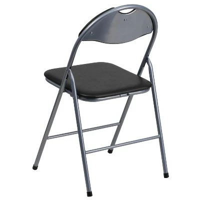 This is not your traditional metal folding chair this chair offers style with its open back design and modern appealing silver powder coated frame finish. Built for the commercial industry, these double braced metal chairs hold up to 300 lbs. This portable chair has a carrying handle to make transporting much easier when storing. No longer be unprepared when guests show up at your front door for an impromptu visit when you can pull these upholstered folding chairs from storage or closet. These chairs fold compactly with a depth of 1.75″ they are ideal in homes and businesses where space is an issue. The vinyl upholstery is easy to clean after you’ve invited everyone over to feast. Minimize the foot traffic in your home by hosting an outdoor gathering while taking advantage of the good weather or so people don’t congregate inside your living room. Store these chairs indoors to protect the frames. These padded folding chairs come fully assembled to be of service upon delivery. Additional Features: Carrying Handle Cutout for easy movement, Designed for Commercial or Residential Use, Folded Size: 17″W x 1.75″D x 35.75″H, Top Review: I purchased these chairs for a business studio and am very pleased with the quality for the price. They are light but not flimsy and are nicely padded on the seat and back.