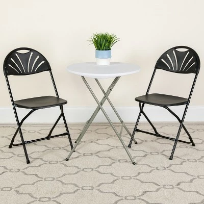 Imagine getting to setup these gorgeous fan back plastic folding chairs outside your venue where wedding ceremonies are held on sunny days as guests sit excitedly awaiting the arrival of the bride. Plastic folding chairs offer an easy seating solution for formal and informal events. Plan high tea, weddings, baby showers, and social events for clients. Folding chairs are more than ideal for the home to accommodate additional people during dinner parties, holidays, game nights, barbecues and book clubs. Their foldable design allows you to store them in your hall closet, garage or underneath furniture if you’re tight on space. With an 18-gauge steel frame built to hold up to 650 pounds you’ll have no problem seating all guests. Although designed for indoor use these foldable chairs have drain holes in the seat to prevent water from pooling during outdoor affairs and the textured seating surface is easy to clean after the most hectic events. Have your facilities manager stock plenty of these popular party chairs. After events these folding chairs stack on top of each other for compact storage, pair with a dolly to transfer between locations or keep them stored on the dolly. Additional Features: Dry assisting drain holes, 18 Gauge Steel Frame, Powder Coated Frame Finish, Non-Marring Floor Caps, Folded Size: 17.5″W x 3″D x 42.5″H