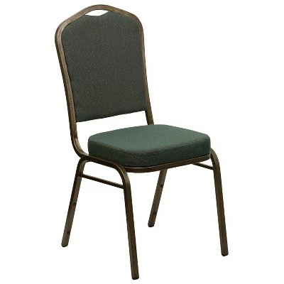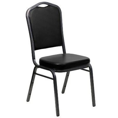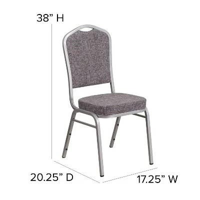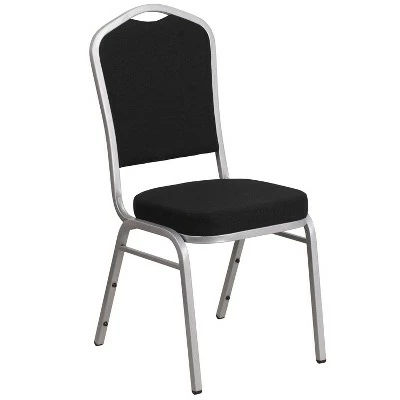 Make an impressive presentation in your banquet hall when clients come to visit your facility with these ballroom chairs. Built for the commercial industry these popular crown back banquet chairs have been tested to hold up to 500 pounds. With a high seating capacity these stack chairs are perfect for the event rental business. This standout hospitality chair can be used as is and still command attention or be dressed up for formal events by placing a chair cover over it. The chair is cushioned with 2.5″ thick CAL 117 fire retardant foam and is covered in durable upholstery for high usage. The sturdy frame with gracefully angled legs are made of 16 gauge steel in a lasting powder coated finish. Double support braces reinforce the frame to give it great strength and durability. Bumper guards prevent scratches on the frame when stacked (up to 15 high) and non-marring floor glides protect your floor by sliding smoothly when you need to move the chair. This multi-use stacking upholstered stack chair is an excellent option for churches, banquet halls, training rooms, hotels, convention centers and schools. Add banquet chairs to your home dining table to add a contrasting look to your dining room or kitchen. Additional Features: 16 Gauge Steel Frame with bumper guards to protect finish while stacked, Floor Protector Plastic Glides, Limited Lifetime Warranty on Frame, Designed for Commercial Use; Suitable for Home Use, Fully assembled stack chair for rental furniture, occasional seating or home use