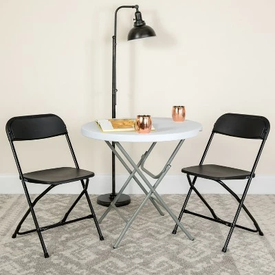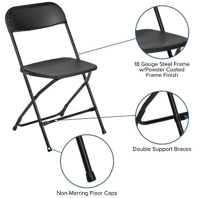 Commercial-grade plastic folding chairs designed to be lightweight but durable. This product is engineered and built with premium materials that will withstand heavy duty use for event, business and home usage. These folding chairs will nest easily to stack 50 high from the floor and feature a textured contoured plastic seat for the highest level of comfort and security. With a variety of color options you can choose what would best pair with your event needs. This is a commercial-grade on-demand seating solution convenient for weddings, school functions, barbecues, game night, and catering events. Stay comfortable during social events with the gentle contour shaped seat and back. Folding chair highlights: – Ready-to-use with no assembly required – Hassle free stackable storage – Textured seat designed for maximum comfort and security – Floor caps to prevent surface and flooring damage – 650LB weight capacity These low-maintenance party event chairs wipe down easily after luncheons and stack neatly for storage or floor maintenance. Make a smart investment by purchasing multiple plastic folding chairs for your rental business, waiting room or corporate training rooms. Purchase our folding chair truck for quick and easy set up and take down. Additional Features: 18 Gauge Steel Frame and Double Support Braces for worry free seating, Powder Coated Frame Finish resists nicks and scratches, Non-Marring Floor Caps protect hard flooring surfaces, Portable heavy duty folding chair for multiple uses – weddings, school assemblies, family reunions, kitchen dining chair, picnics