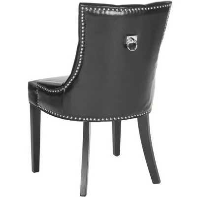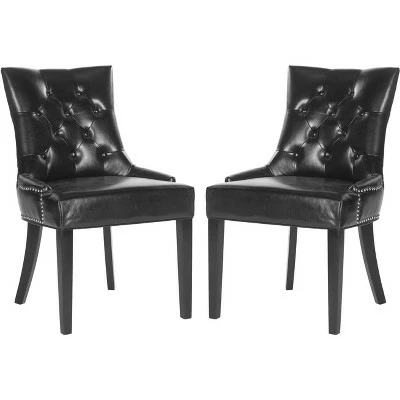 The stylish Harlow ring chair by Safavieh transforms any dining room with instant glamour. Dressed up with silver nail heads and a clever metal ring on its back, Harlow is shown with birch legs in espresso. Button tufts on the front of the tapered backrest add to the allure of this set of two chairs. Care Instructions: Although leather is one of the most durable upholstery materials, proper care is vital to maintain its appearance and performance. Dust weekly using a soft, clean cloth slightly dampened with distilled water. Blot spills immediately with a soft, clean absorbent dry cloth.