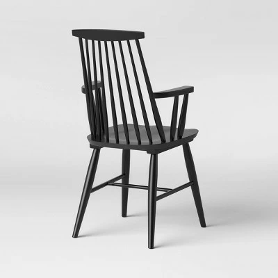 The Harwich Wood Dining Armchair from Threshold™ is perfect for updating your dining room or kitchen. Crafted from hardwood for durability and long-lasting style, this solid-color armchair features a timeless design inspired by the classic Windsor chair — showcasing a spindle back, contoured seat and splayed legs. As functional as it’s beautiful, this wooden dining chair makes a versatile addition to your home.