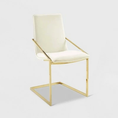 Freely flowing angles form the understated elegance of the Pitch Performance Velvet Upholstered Dining Armchair. The Pitch Dining Chair has a geometric gold stainless steel frame with non-marking foot caps, and a foam padded plywood seat. Covered in soft and stain-resistant performance velvet upholstery, the Pitch Accent Chair embraces open space for a notable modern chair that stands out amongst your dining room decor. Chair Weight Capacity: 330 lbs.