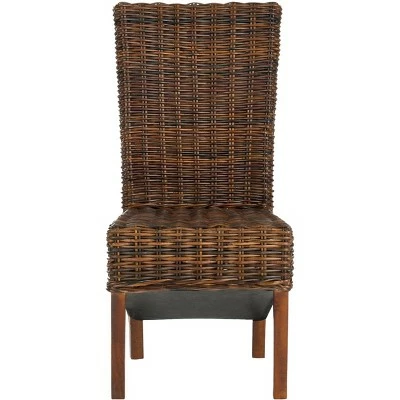 A familiar, elegant dining room form gets updated in the Ridge side chair, crafted of rattan and sustainable mango wood and shown in tropical dark brown finish. Organic rattan wraps around a tall, gently tapered backrest and seat; shorter rear legs and exposed underbelly offer yet another contemporary twist. Care Instructions: Dust regularly with a soft, dry cloth. Never use oiled or treated cloths on lacquered finishes. Some finishes can be wiped with a damp (not wet) cloth, followed at once by rubbing with a dry cloth to remove fingerprints and smudges. For persistent spots, gently clean with a soft cloth and a solution of water and mild soap, make sure to wipe dry. Use adhesive felt pads, coasters and placemats to protect your furniture.