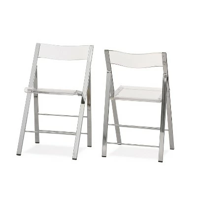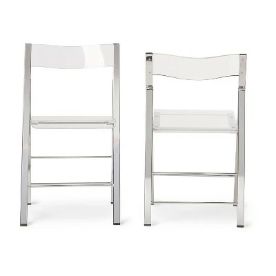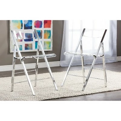 Acrylic folding chair constructed of chromed steel, ergonomically sculpted back, rubber feet to prevent scratching wood floors, foldable for easy storage.