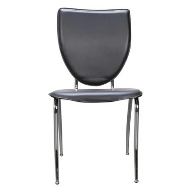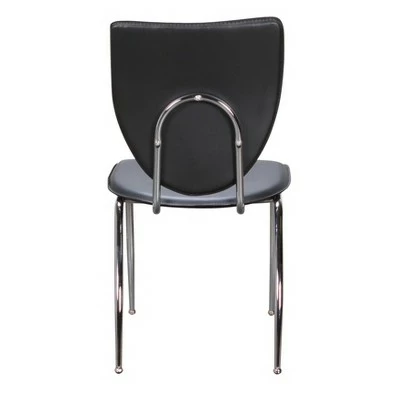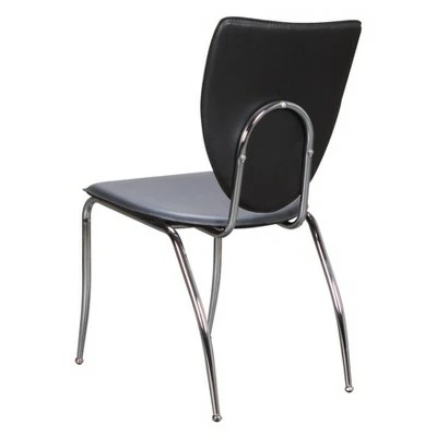 This side chair exudes professionalism and is ideal for a corporate workplace environment or private office. The contours of the backrest resemble a coat of arms, a reminder of a mission statement or the greater goals that motivate us. Commercial grade steel ensures that the frame is strong and durable, while black faux leather upholstery caters to comfort and easy cleaning. Each chair supports up to 300 lbs and is outfitted with plastic glides to protect floors from wear and tear.