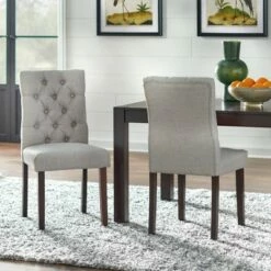 Refresh your dining table with the Annie Tufted Dining Chair (Set of 2) from Buylateral. Detailed button tufting combined with a time-honored parson style design, allows this chair to perfectly coordinate with various styles of dining tables. Upholstered in a neutral gray fabric with dark espresso brown legs, this chair will provide many hours of comfort while entertaining family and friends alike.