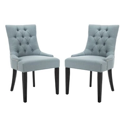 The luxurious Deco silhouette of the Abby side chairs by Safavieh brings chic, modern style to the dining room. Navy linen upholstery highlights a curvaceous figure while sleek birch wood legs with a white washed finish add just a touch of Park Avenue style. Available in multiple soft neutral upholstered colors, these set of dining chairs are easy to style and go well with various decor styles, especially nautical, shabby, or transitional decor. This item requires assembly and has a sturdy build of 275 pounds.