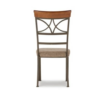 This Dining Chair features a diamond shaped back and slight curved legs. The top of the back piece is a sleek “Brushed Faux Medium Cherry” wood, while the frame is a “Matte Pewter and Bronze” metal. This piece is sure to add interest and extra seating to your table. Perfect complement to This Dining Table. Some assembly required. Priced separately. Two chairs in a carton.