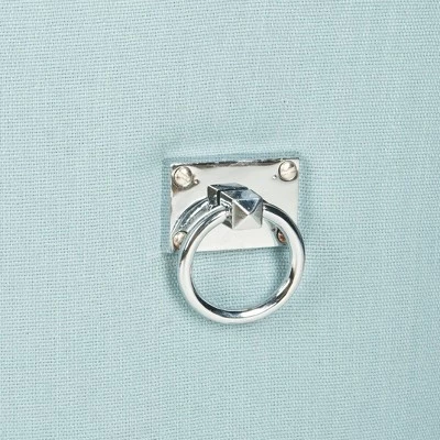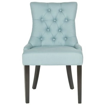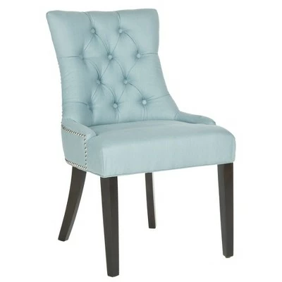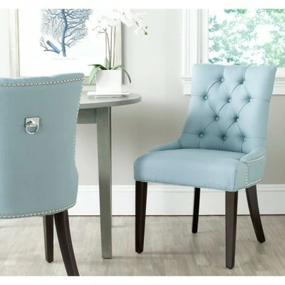 The stylish Harlow ring chair by Safavieh transforms any dining room with instant glamour. Dressed up with silver nail heads and a clever metal ring on its back, Harlow is shown in a light blue cotton and linen blend fabric with birch legs in espresso. Button tufts on the front of the tapered backrest add to the allure of this set of two chairs.