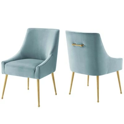 Gently sloping arms cascade down from the flowing design of the Discern Performance Velvet Dining Chair Set of 2. Solidly constructed from wood and plywood, Discern comes with dense foam padding upholstered in stain-resistant performance velvet. Complete with splayed brushed gold stainless steel legs and matching decorative handle on the back of the chair, Discern is a soft and durable addition to the dining room, kitchen entryway, living room, bedroom, home office, or vanity. Create a cozy seating experience with these versatile dining accent chairs complete with non-marking foot caps.