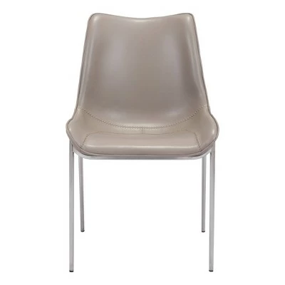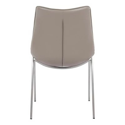 This armless contoured chair with its simple silhouette can dress up your dining space or keep things casual. Beautifully stitched design on gray faux leather keeps an eye on the details. Comfortable enough to use as a desk chair. Brushed Stainless Steel legs are complete with protective plastic feet to keep your floors scratch-free.