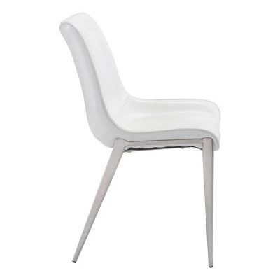 This armless contoured chair with its simple silhouette can dress up your dining space or keep things casual. Beautifully stitched design on white faux leather keeps an eye on the details. Comfortable enough to use as a desk chair. Brushed Stainless Steel legs are complete with protective plastic feet to keep your floors scratch-free.