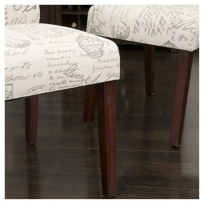 These Christopher Knight Home French Beige Printed Linen Dining Chairs (Set of 2) will add a unique flair to your dining space. Designed with French handwritten pattern over beige linen and espresso colored legs, you will be sure to get attention with these chairs. Add them to your existing dining table or place then in your living room or entertaining space to provide extra seating. These Christopher Knight Home French Beige Printed Linen Dining Chairs will be a conversation starter in your home.