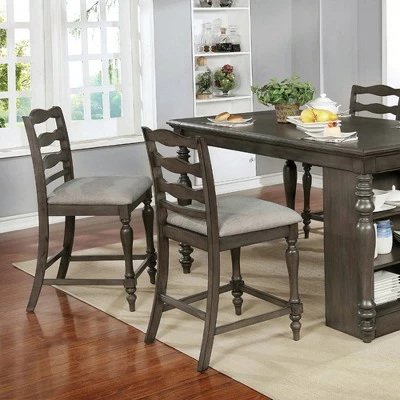 Bring a touch of opulence to your dining table with the Graves Wood Counter-Height Dining Chair Set from Homes: Inside + Out. Turned wood legs bring the perfect hint of classic style while the back legs boast a tapered design to not overwhelm the elegant aesthetic, and you’ll love the added sophistication of slatted detail with a curved design on the back. A taupe cushion completes the look with comfort and mature style, making this gray wood dining chair set a timelessly elegant piece for your dining area.