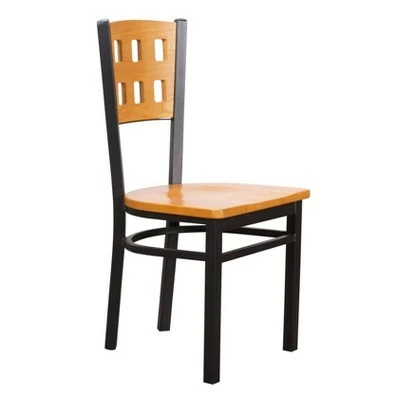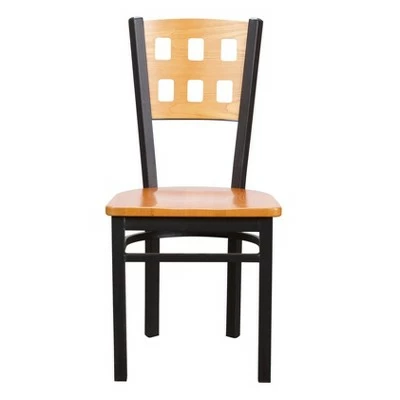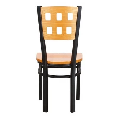 The square hole pattern on the backrest of this chair provides an eye catching twist to an otherwise standard and reliable staple of commercial seating. Steel framing ensures strength and durability for years to come, while the medium oak stained wood seat allows for easy cleaning. The set of 2 comes equipped with plastic glides to protect floors from wear and tear and supports up to 300 lbs each unit. Create a welcoming environment for guests and employees alike with these comfortable and easy to manage side chairs.