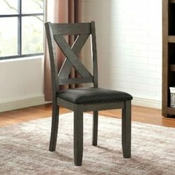Bring standout style to almost any eating area with this set of two side chairs. Attractive nail head trim surrounds the fabric seat, and a cross back design is the cherry on top for the rustic design. Pull this set two side chairs up to the table and enjoy a meal, or leave them off to the side as a statement-making piece.