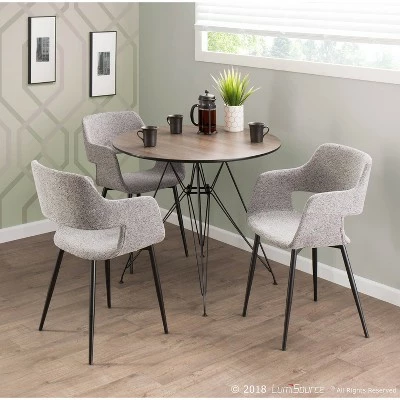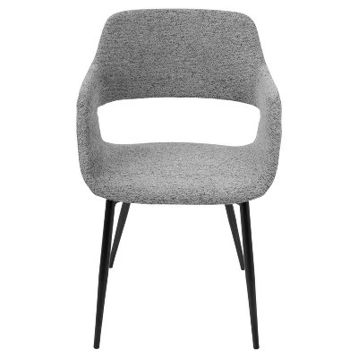 Inspired by Mid-Century design, the Margarite Dining Chair features a low backrest with a slight opening, ergonomically designed to fit your body, armrests for additional comfort and tapered metal legs. Upholstered in a variety of colors, the Margarite Dining Chair will look great in any dining area or living room.