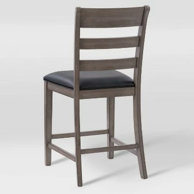 These ladder back counter height classic washed gray dining chairs have a high back for support and a foam cushion wrapped in a black leatherette that is durable and easy to clean. In a neutral washed gray they fit perfectly in any living or dining space. Coming in a set of 2 they are a cohesive mix of style and comfort