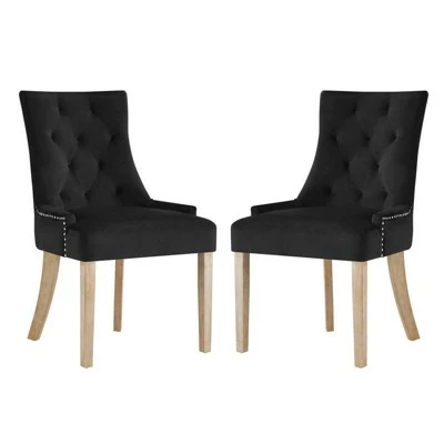 Update your dining room décor with the Pose Performance Velvet Dining Chair Set. Designed with a charming modern farmhouse aesthetic, Pose features elegant tufting, exquisite nailhead trim, padded seat and back with soft, stain-resistant performance velvet upholstery, and a décorative metal ring on the chair back for a delightful finishing touch. Supported by solid natural wood legs with flared back legs and non-marking foot caps, Pose is a distinctive dining chair perfect for the modern home.