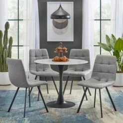 - Chairs crafted of MDF, fabric, foam, and solid Beech wood legs