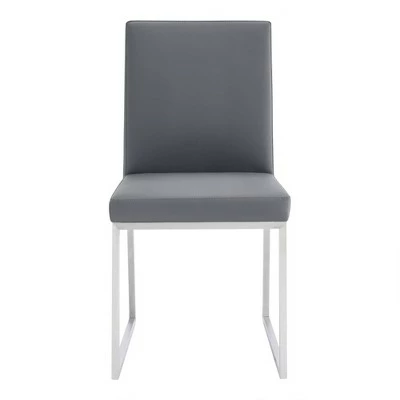 Impeccable style meets high-design in our contemporary Trevor dining chairs. It’s Brushed Stainless Steel frame and clean silhouette is upholstered in a beautiful Gray Faux Leather that is both neutral, soft to the touch and durable. The modern look of this dining chair allows it fit perfectly in your contemporary home. It is smart around a dining table, or as additional seating around your home.