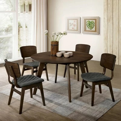 The Welch Cushioned Wood Dining Side Chair Set from HOMES: Inside + Out brings a beautiful blend of modern and classic style to your dining space. These wood dining chairs boast a minimalistic look with tapered legs and a dark brown finish, while fabric upholstery brings a touch of detail to the seat with its tufted design. The gray color of the cushions coordinates with a variety of accent pieces, making for the perfect dining chair set to fill your space with comfort and style.