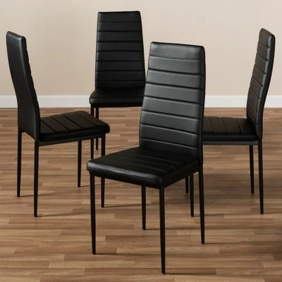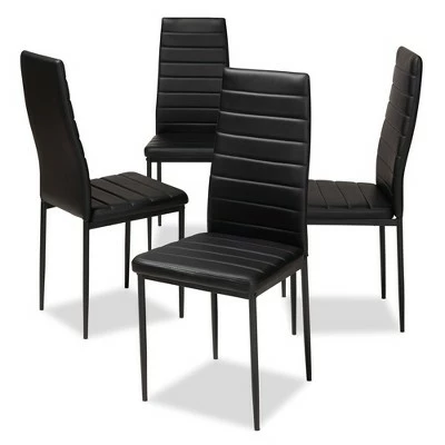 The sleek and minimalist look of the Armand dining chair will bring cool vibes to your space. The modern and contemporary-inspired design of the chair is trendy yet timeless. The faux-leather upholstery of the Armand is easy to coordinate with your existing decor, and the horizontal, slatted chair back design amps up the clean, cool look of the chair. finishing on the chair’s sturdy, metal legs adds the final touch to an overall modern, streamlined look. The Armand features foam padding and a gently arched chair back to encourage hours of comfort. This chair will be the simple solution you’ve needed to add that cool, executive look to your dining room, reception area, or other shared space. Made in China, this chair requires assembly. Dimensions: 38.58″ High x 16.54″ Wide x 19.69″ Deep; Seating Dimensions: 18.11″ High (from Floor) x 19.69″ Wide x 16.54″ Deep; Back: 20.94″ High; Legs: 16.93″ High