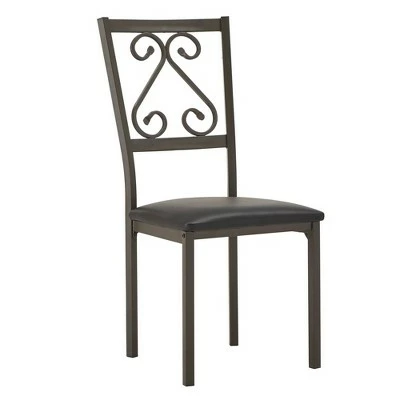 Add elegant style and comfort to your kitchen with the Ramona Brown Finish Side Chair (Set of 4) – Brown from Inspire Q. Perfect for eat-in kitchens, this set features sleek, brown metal frames decorated with a romantic scroll design that will never go out of style. The seat cushions have a plush foam filling and are upholstered in black faux leather for comfort and support during your meals. This set’s dark neutrals and timeless design is sure to fit right in with your unique style.