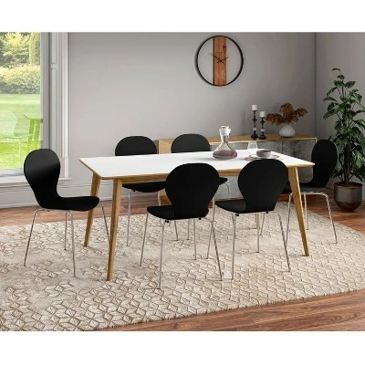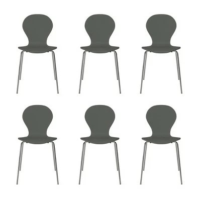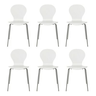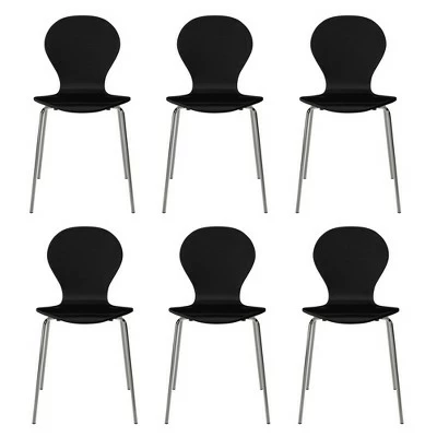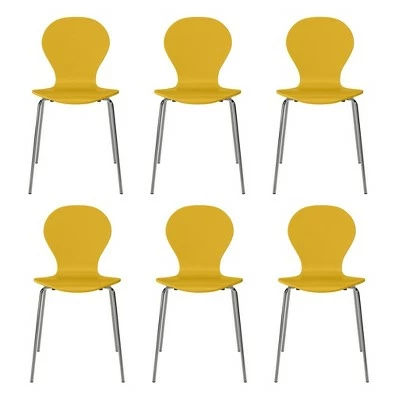 This set of 6 armless wood dining chairs exemplifies mid century modern design that will update the look of your home. These minimalistic chairs have shapely silhouettes with great scale that makes them the perfect addition for the dining room, kitchen, desk or anywhere else you might need an extra seat. These convenient chairs can also be stacked together for storage when not in use.