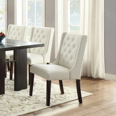 Turn your kitchen island into a convenient dining space with these dining chairs. Soft white leather-upholstered foam cushions, button tufted backrests, and wood legs combine to offer excellent seating comfort and body support.