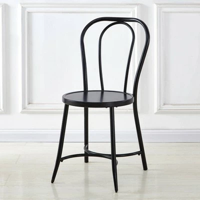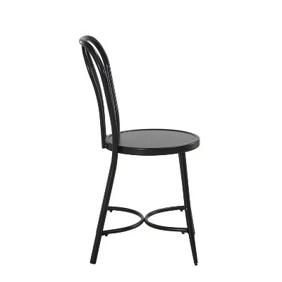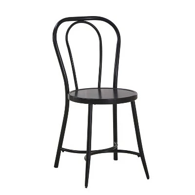 Bring home the romance of a French Bistro with the Claire collection of marble and metal tables and chairs. The Claire Bistro Chair features a shaped metal seat and iron base with stretchers for added stability all in a black powder coat finish. Leg levelers are included. Your purchase includes two side chairs.