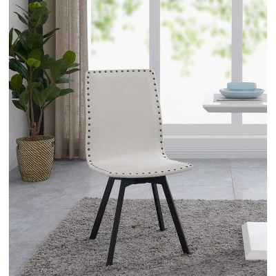 The Studded Linen Swivel Set is sure to bring flare and class to any dining room or kitchen. This set is defines contemporary décor by accenting clean, cream linen with studs that follow the outsides of the seat. The added swivel function is sure to wow the guests at your next dinner party. Sold as a set of two. Assembly instructions included.