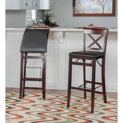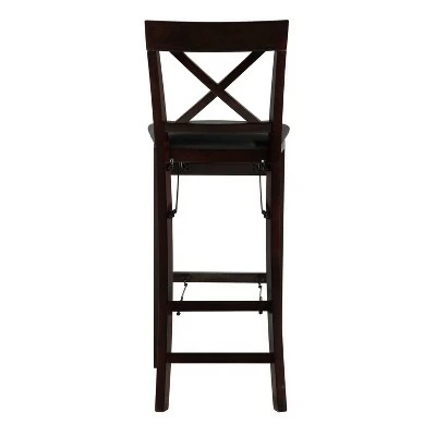 The elegance and unique style of this X Back Folding Bar Stool will carry throughout your kitchen, dining, or home pub area. Finished in a rich Espresso, the seat is upholstered in a wipe clean brown vinyl. The folding feature makes it simple to easily store the stool when space is needed. Front and rear supports provide stability. 30″ Seat Height. 275-pound weight limit.