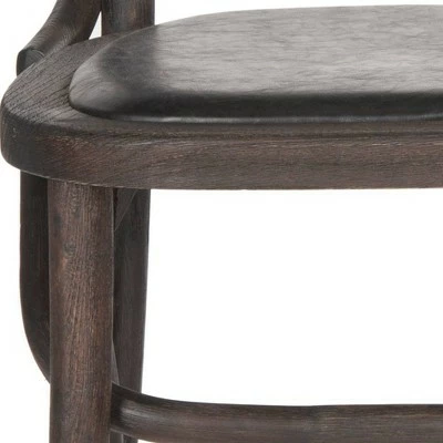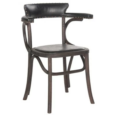 Straddling country, retro and industrial chic styles, the York arm chair is reminiscent of Thonet bentwood seating. Crafted of oak in dark chestnut with antiqued black faux leather upholstery, this classic dining chair is finished with brass nail heads. The York arm chair is ideal in a kitchen breakfast nook or dining room.